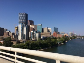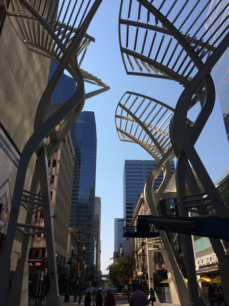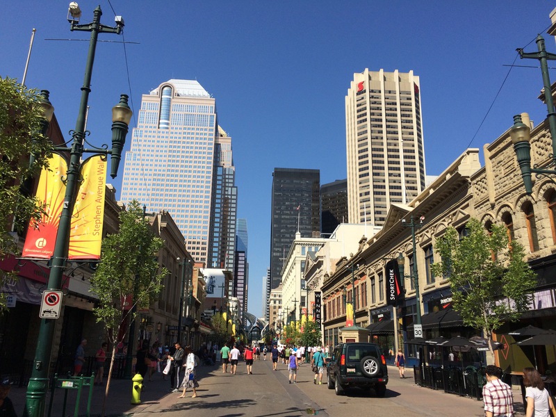 nun geht es nach calgary. kurz vor calgary gibt es etwas zu feiern. wir passieren die 20.000 km marke unserer reise. und es ist wirklich erstaunlich wie zuverlässig und ohne probleme der josch das alles mitmacht. immerhin ist er ja nun schon 40 jahre. für ein auto ein sehr stolzes alter. schon von weitem sieht man die beachtliche skyline von calgary. calgary war 1988 schauplatz der olympischen winterspiele. aber dazu später mehr. zunächst fahren wir zu einem etwas außerhalb liegenden walmart um dort zu übernachten. der walmart liegt in einem etwas zwielichten viertel. wir bleiben trotzdem dort und nehmen das als übung für unsere zeit in mexiko. die nacht verläuft ruhig und so fahren wir bei strahlenden sonnenschein mit der josi ins zentrum der stadt. dort angekommen schlendern wir zunächst durch die fußgängerzone der stephen av. mit vielen restaurants, cafes und bars. sehr schön angelegt, aber leider sehr wenig geschäfte. also ziehen wir weiter richtung kensington-village.