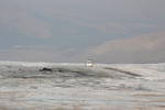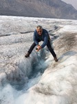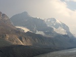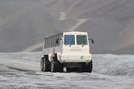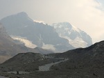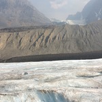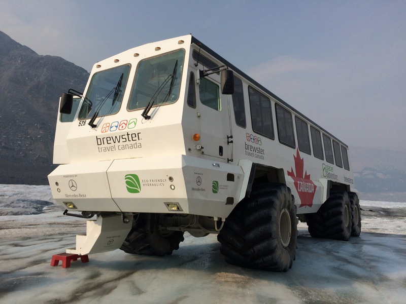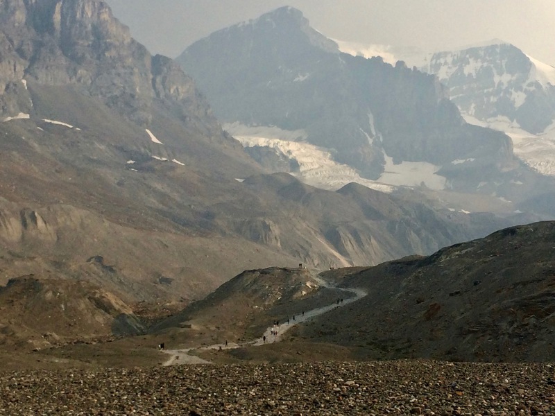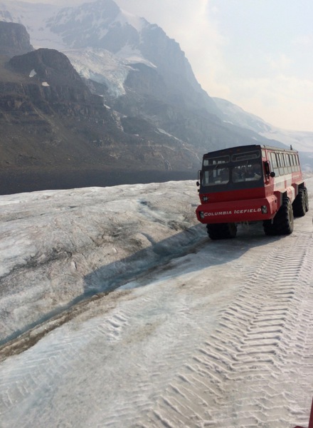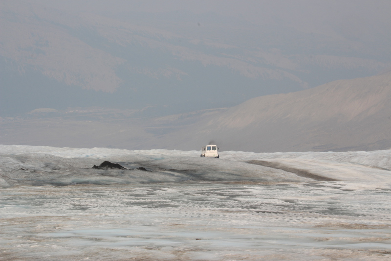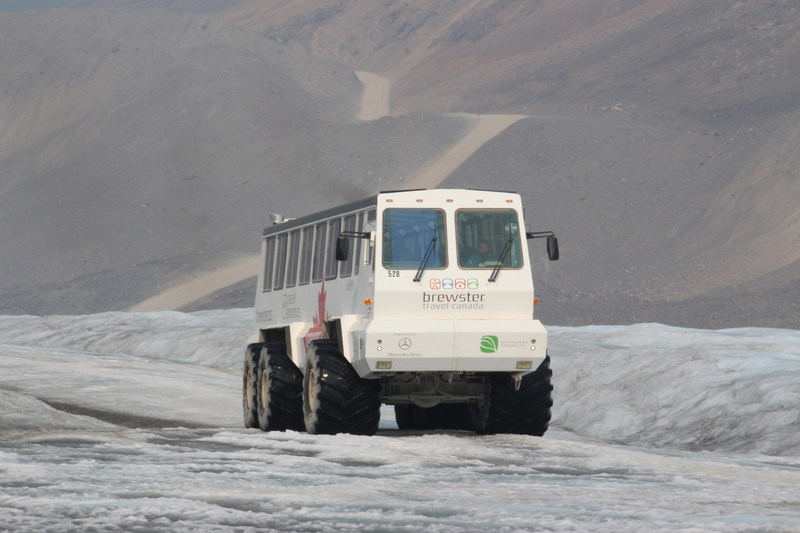 ca. 1 km nach lake louise beginnt der icefield parkway. nun fahren wir diese panoramastraße hinauf, um zum columbia icefiled zu gelangen. das ist ein 326 qkm großes gletschergebiet, welches 8 gletscher speist. die dicke des eises beträgt 100 bis 365 m. pro jahr fallen im durschnitt 7 m neuschnee. das schmelzwasser dieser gletscher landet in 3 ozeanen. im pazifik, im atlantik und im nordpolarmeer. ein gigantischer eisklotz den wir nun erkunden wollen. dazu haben wir eine tour mit dem icefield explorer gebucht. das sind spezialfahrzeuge mit riesigen reifen und extrem niedrigen übersetzungen, um damit auf dem gletscher fahren zu können. angeblich sollen die reifen einen geringeren druck auf den gletscher ausüben als wir mit unseren füßen. ich habe da meine zweifel, trotz der immensen dimension der reifen. ist aber auch nicht wesentlich. wesentlich ist, dass die tour auf den gletscher mit diesem kolloss schon einmalig ist. wir fahren rauf auf den athabasca gletscher und parken ziemlich genau in der mitte des riesigen gletschers. dort kann man austeigen und fotos machen, gletscherwasser trinken und die aussicht geniessen.