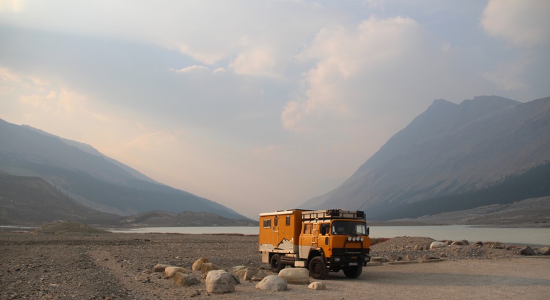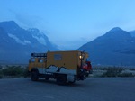 zu unserer großen überraschung und freude gibt es direkt am columbia icefield glacier discovery center einen overnight parkplatz mit sicht auf den athabasca gletscher, auf dem wir dann übernachten. wieder einmal kostenlos.