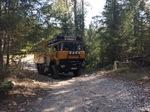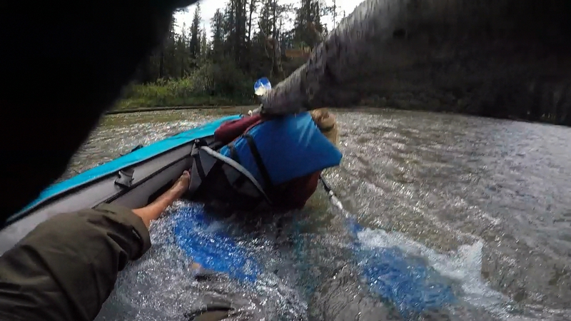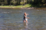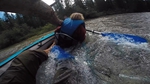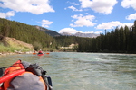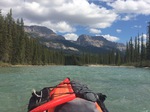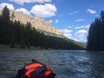 so geht es dann bei strahlendem sonnenschein den tag darauf los. zunächst fahren wir 10 km rauf zum startpunkt und laden dort das kajak aus, bauen es auf und verstecken es so gut es geht am fluß. dann bringen wir den josch 22 km runter zum endpunkt der tour (castle junction). von dort dann mit der josi wieder zurück zum startpunkt, immer hoffend, dass das kajak noch da ist wenn wir ankommen. es ist noch da. wir schliessen die josi an, und dann endlich starten wir in unser kleines abenteuer. am startpunkt sind noch 4 männer die die gleiche tour fahren wollen. sie fahren alle in einzelkajaks. wir sind aber früher fertig und starten als erstes. der startpunkt liegt an einem kleinen etwas ruhigeren und relativ schmalen nebenarm des bowriver. wir sitzen noch gar nicht so richtig als 2 kleine baumstämme zu 2/3 den bach blockieren. wir versuchen noch vorbei zu steuern, schaffen es aber nicht und geraten unter die bäume. obwohl nur der kleine nebenarm, ist die strömung so stark, dass sie uns samt kajak unter die bäume drückt. keine chance. nach ca. 100 m und 30 sekunden sind wir gekentert und klatschnass. frust. (siehe hierzu den film - erik hatte glücklicherweise bei abfahrt die gopro angemacht) ausser dass ich mein paddel verloren habe, ist aber alles heil. wir haben vorsorglich trockene sachen mitgenommen. also ziehen wir uns um, entleeren das kajak und fahren mit einem paddel weiter. so schnell geben wir nicht auf. inzwischen sind auch die 4 männer an uns vorbei. sie hatten das glück uns zu sehen und sind kurz von den bäumen ausgestiegen und haben sozusagen geschoben. nun fahren wir hinterher und können so sehen welchen weg sie wählen. das funktioniert wunderbar. auch dass wir nur ein paddel haben erweist sich als problemlos. lediglich, wenn wir durch sehr starke stromschnellen (maximal class 1) fahren schwappt immer wieder wasser ins boot., so dass wir ab und an stoppen müssen um wasser zu schöpfen. macht ein heidenspass. nach 4 stunden kommen wir glücklich und heil am ziel an, wo der josch schon auf uns wartet. während wir uns trockene sachen anziehen und stärken, trocknet das boot. dann fahren wir los, und holen die josi am noch am startpunkt ab.