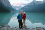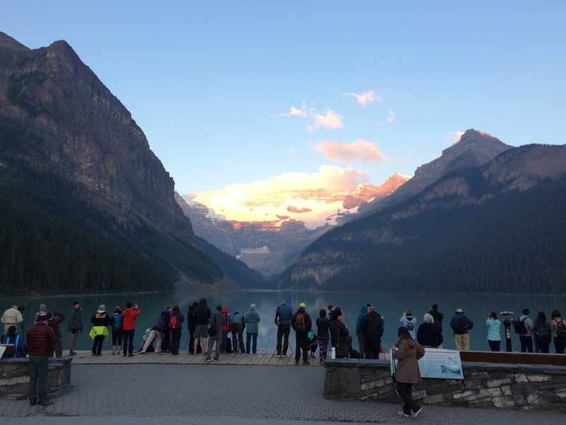 nach einem erfolgreichen shoppingtag in banff, stehen wir am folgetag um 4:30 uhr morgens auf und verlassen so leise wie möglich den campground. der lake louise steht auf dem programm. eines der highlights des nationalparks. man sollte vor 7 oder nach 19 uhr dort sein, um eine gute chance auf einen parkplatz zu haben. wir erreichen den parkplatz um 6:15 uhr. und wir sind bei weitem nicht die ersten. aber es ist noch relativ leer und der anblick des sees raubt einem den atem. die farbe und das panorama einfach zu schön um wahr zu sein. man kann sich gar nicht satt sehen und nicht aufhören zu fotografieren, weil man immer wieder denkt, dass der gerade aktuelle blick noch schöner als alle vorherigen sind. die farbe des sees erscheint je nach blickwinkel und sonneneinstrahlung anders. das türkis der seen hier, stammt vom steinmehl das vom gletscherschmelzwasser in die seen gespült wird. das steinmehl nennt man hier „rock flour oder glacier flour“. es ist aber noch sehr kalt und so wärmen wir uns nach 1,5 h kurz im josch auf und essen was.
