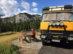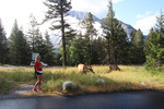 wir nisten uns in dem nahe gelegenen tunnel mountain village campground für 2 nächte ein. als wir am nächsten morgen erwachen, bewundern wir nicht nur das panorama auf die umliegenden steilen und schroffen bergmassive, sondern auch diverse grasende elche auf der wiese vor unserem josch.
