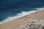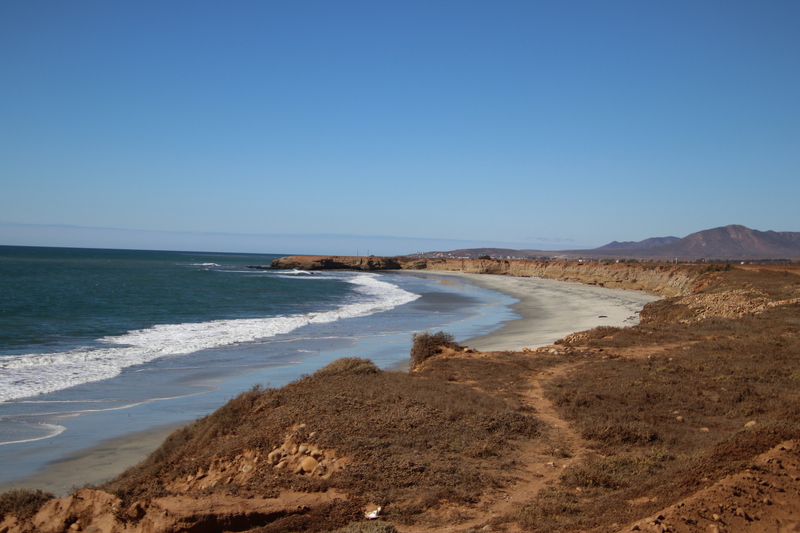 ca. 80 km südlich von ensenada biegen wir auf eine asphaltierte strasse an die küste ab. wir denken uns, dass wir lieber die straße an der küste fahren, als die mex 1. kurz vor der küste, geht die straße abrupt in eine schotterpiste über. wir versuchen den richtigen weg zu finden und folgen den schildern nach „malibu beach“. dann endet die straße am meer. vor uns ein langer strand, eingebettet in felsige steilküste. total schön. wir parken auf dem felsigen plateau und überlegen ob man hier übernachten könnte. ich habe im gegensatz zu dani kein gutes gefühl. leider, weil der platz an sich perfekt ist. so fahren wir den weg, den wir gekommen sind, wieder zurück.