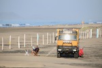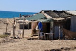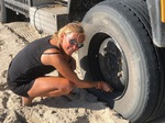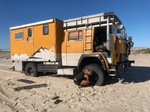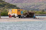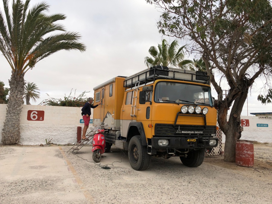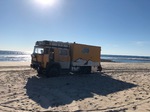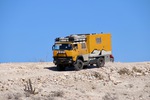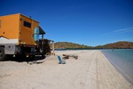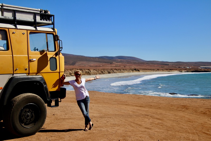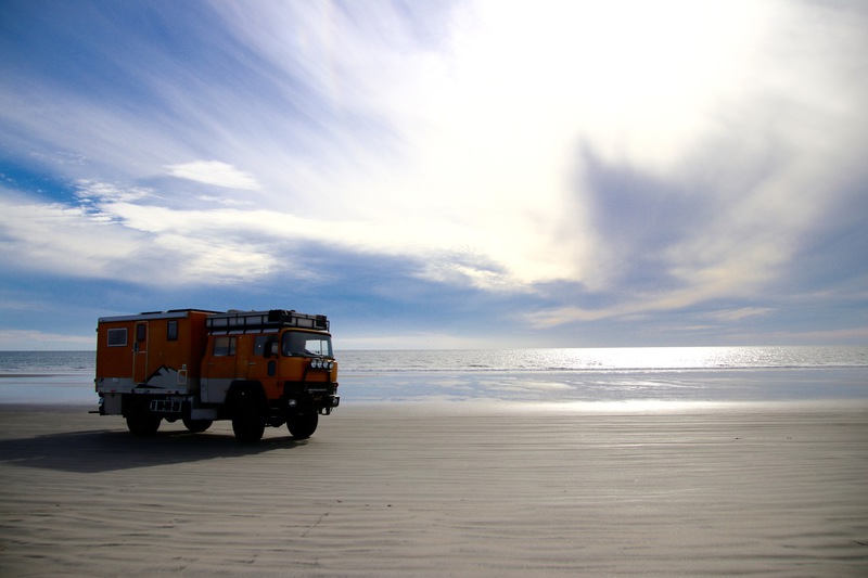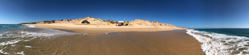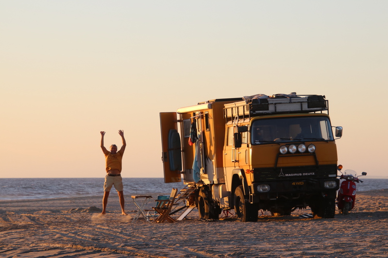 zum nachmittag hin, beginnen wir mit der suche nach einem platz für die kommenden tage. es gibt immer wieder kleine abzweige die direkt ans meer führen. oftmals trockene kleine flussläufe. wir fahren in mehrere rein, finden aber nicht so recht den idealen standort. noch nicht. man darf eben nicht gleich den erst besten nehmen. der jetzige ist zwar mit etwas aufwand verbunden, aber das lohnt sich. wir müssen mal wieder die luft aus den reifen lassen und die sandbleche zur hilfe nehmen um den josch auf einen guten platz zu manövrieren. ne gute stunde brauchen wir, dann ist es geschafft. wir haben einen traumplatz. einsame bucht. sandstrand. türkises meer, keine 10 m bis zum wasser und sicher. besser geht es nun wirklich nicht.