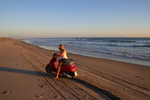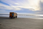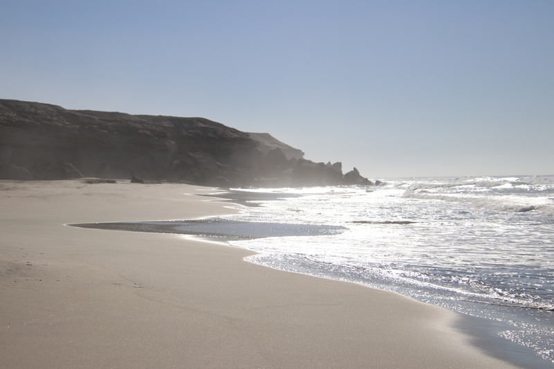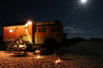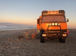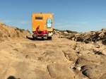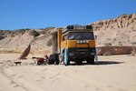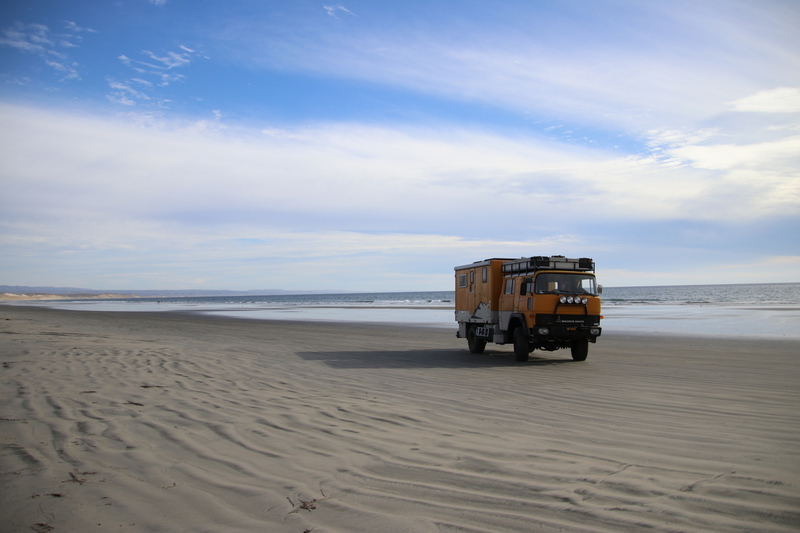 dann erreichen wir ein kleines plateau, an dem uns diverse camper recht euphorisch begrüßen. für unseren geschmack zu euphorisch. also fahren wir ein stück weiter in einem ausgetrockneten flussbett direkt auf den weiter unten gelegenen sandstrand. dort sind wir allein, bleiben aber auch zunächst im tiefen feinen sand stecken. erst nach luft ablassen und mithilfe der sandbleche erreichen wir einen guten und sicheren standort.