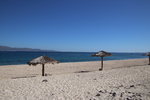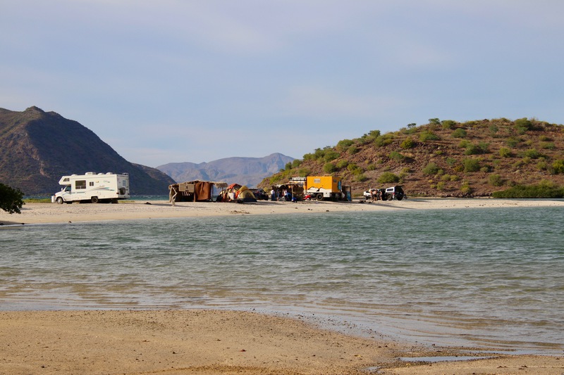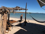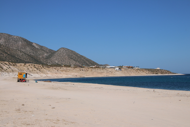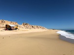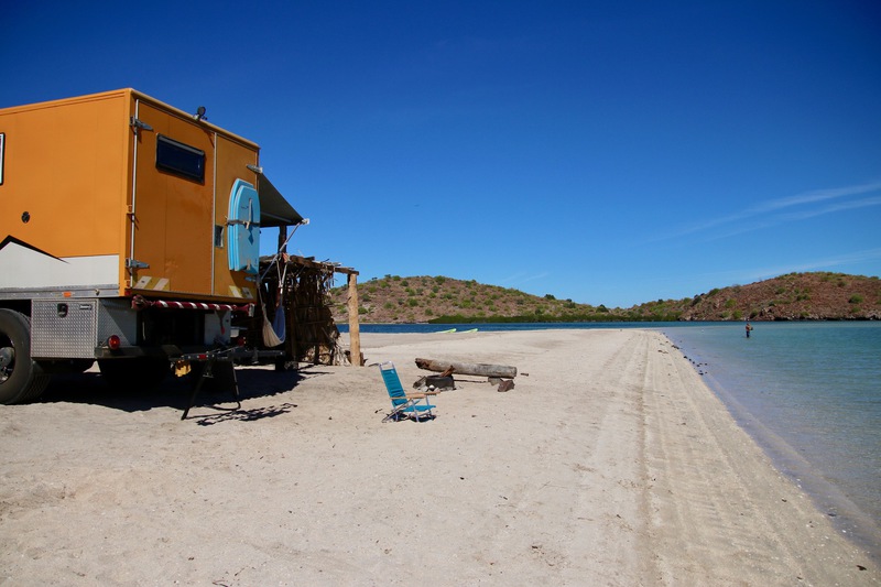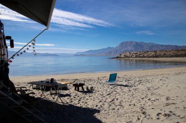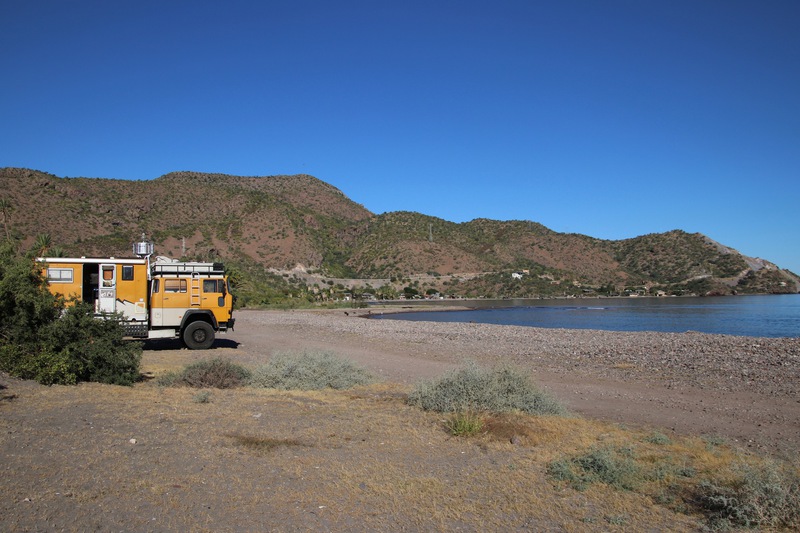 um unser letztes ziel auf der baja zu erreichen, müssen wir die küstenstrasse verlassen und die mex 1 nehmen. die küstenstraße ist zu schmal für uns und den josch. la ventana heisst unser ziel. gemäß unserem campingführer gibt es dort keinen campground und auch was wir sonst gelesen und gesehen haben muss es dort schöne, einsame strände geben. als wir la ventana erreichen, sind wir etwas überrascht. es ist eine kite-surfer hochburg. es reihen sich hotels, surfshops, restaurants und campgrounds aneinander. von einsamen stränden kann keine rede sein. wir sehen uns schon auf einem der campgrounds, fahren aber zur sicherheit durch la ventana und den nachbarort el sargento hindurch. gemäß navi endet die strasse hier. tut sie aber nicht. sie führt uns an einen kleinen sandstrand mit ein paar sonnenschirmen aus palmenwedeln. dort stehen auch schon 3 camper. aber ein stückchen weiter finden wir noch ein ruhiges plätzchen. nicht total einsam, aber wieder sehr schön.