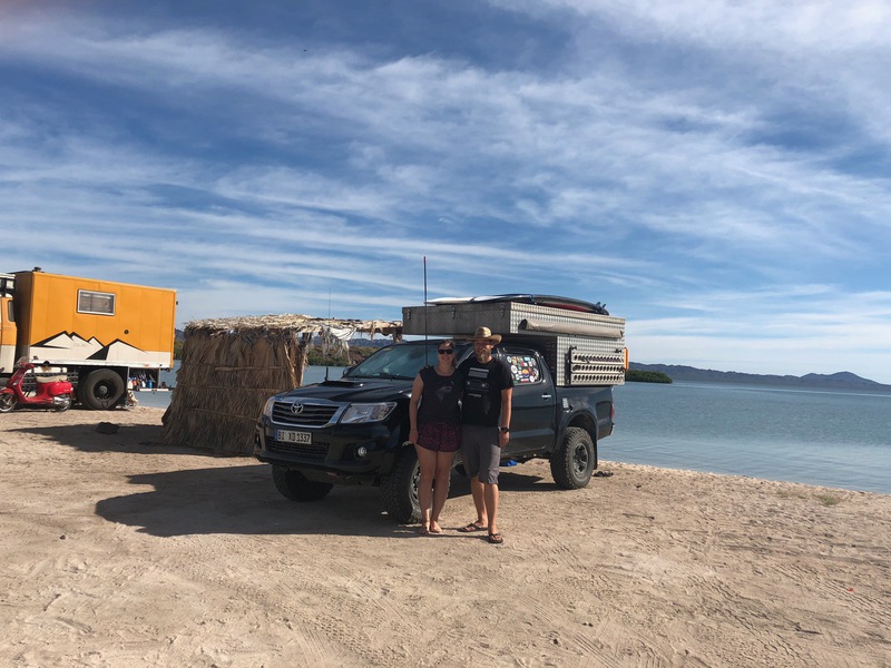die händler sind gerade fort, als eines der pärchen aus guerrero negro auf den campground fahren. es sind amra und daniel aus bielefeld in einem toyota-pickup. auch sie bleiben über nacht und wir laden sie etwas später zum abendlichen grillen ein. die beiden fahren am nächsten tag weiter.