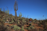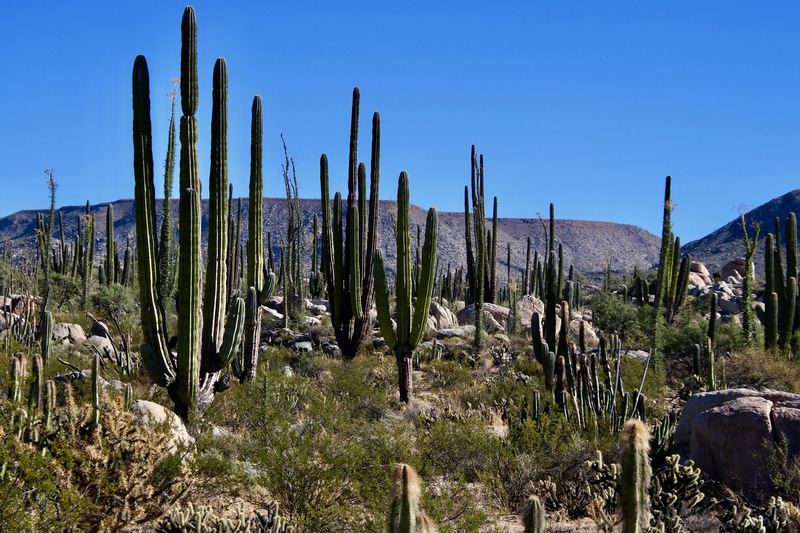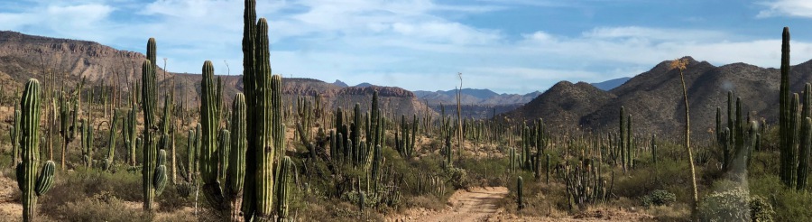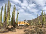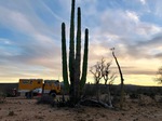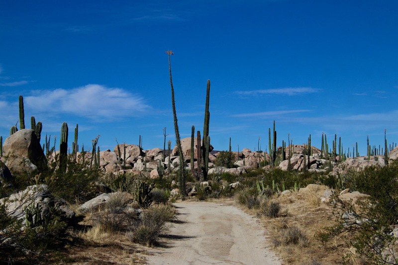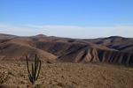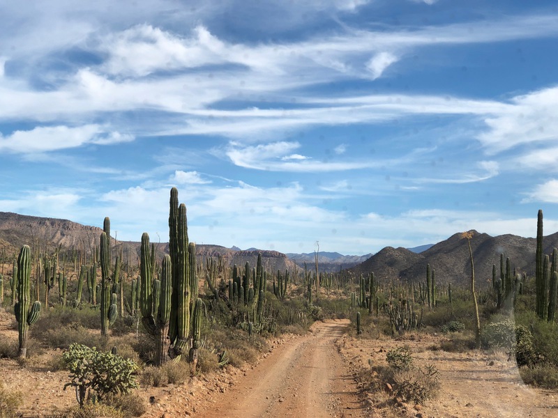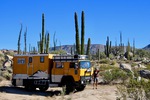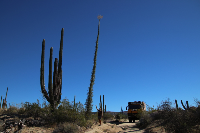 es geht weiter. kurz nach san quintin schwenkt die mex nach osten, um durchs landesinnere an die küste des golf von californien zu führen. der weg geht durch das „valle de los cirios“. cirios sind nur hier auf der baja vorkommende kakteen. aber es gibt noch jede menge anderer kakteen und insbesondere die saguaro-kakteen sind teilweise riesig (werden bis zu 20 m hoch). da wirkt selbst der josch winzig. eine einzigartige ganz besondere landschaft. wir überlegen, ob wir in der kakteenwüste etwas abseits der straße übernachten sollen, finden aber keinen platz, der von der straße nicht einsichtig ist.