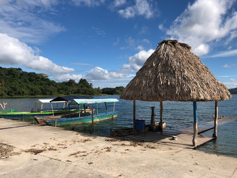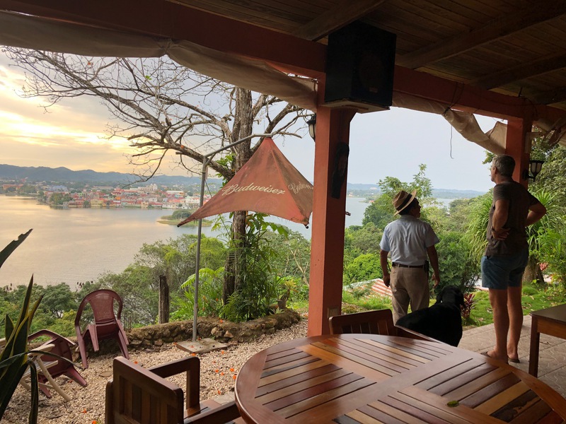das zentrum von flores liegt auf einer insel im lago petén itza. es ist mit dem restlichen teil der stadt und dem „festland“ mit einer brücke verbunden. auf der anderen seite des sees, also gegenüber von flores liegt san miguel. dort haben wir einen schönen platz auf dem grundstück eines restaurants "chal tun ha" (www.chaltunhalodge.com), wo auch camper stehen dürfen, direkt am see gefunden. wir stehen etwas erhöht und können von der terrasse des restaurants direkt auf flores gucken. eine tolle aussicht