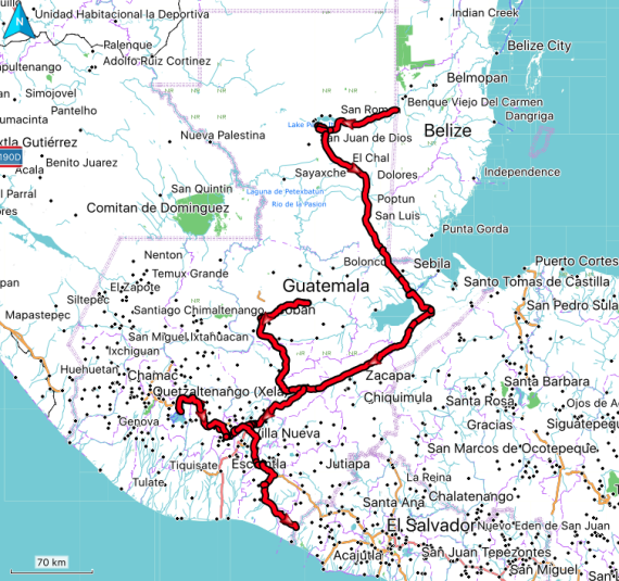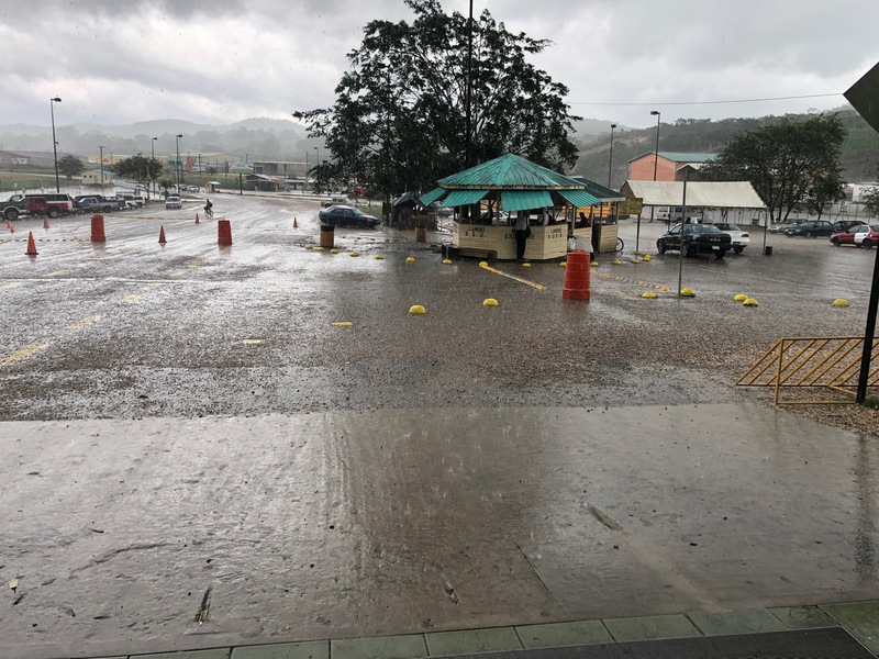 guatemala. eines der länder welches wir am wenigsten einschätzen konnten. wie wird es sein? geht man nach den berichten im internet und den reisewarnungen des auswärtigen amtes, dann ist es fast noch gefährlicher als mexiko. da wir inzwischen schon in mexiko waren, und unsere eigenen positiven erfahrungen sammeln konnten, sind wir guter dinge. aber mit einer gewissen erhöhten vorsicht. hatte sich die mexikanische grenze noch als sehr modern und die belizianische dann als etwas weniger modern gezeigt, so präsentiert sich guatemala an seiner grenze als sehr einfach und mit viel regen. das grenzgebäude, in dem wir uns den einreisestempel für uns und den josch holen müssen, ist ein nach vorne vollständig offenes, mit einem blechdach versehenes u. ähnlich einer überdachten bühne. es geht alles sehr entspannt zu. keine uniformen, keine türen, keine scheiben. einfach nur ein langer tresen an dem die verschiedenen formalitäten erledigt werden. dafür aber immer wieder heftige regengüsse. ein junge ist für das holen von essen und getränken zuständig. an der wand hinter den grenzbeamten hängt ein großer flatscreen auf dem gerade championslegue läuft (bvb – real madrid). wenn der junge gerade keine aufgeben hat, guckt er fußball oder spielt mit dem handy. aber auch wenn etwas anders, als wir es gewöhnt sind, so funktioniert alles reibungslos und wir können nach ca. 1 h einreisen.