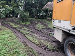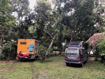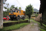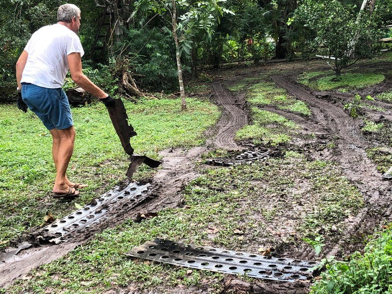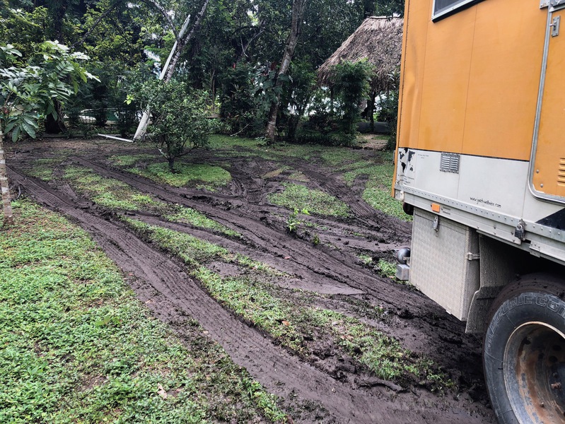 die starken regenfälle der vergangenen tage, haben die wiese auf der wir mit dem josch stehen aufgeweicht. und obwohl es nur ein kleines stück bergauf geht, müssen wir nach mehreren vergeblichen versuchen unsere sandbleche aktivieren. damit kommen wir letztendlich raus, hinterlassen aber ein kleines schlachtfeld. viel ist nicht von der wiese übrig. zum glück ist die straße nach rio dulce durchgehend asphaltiert.