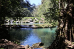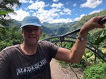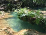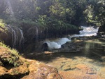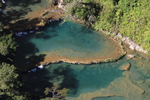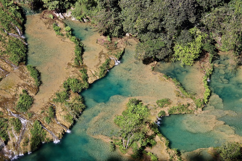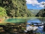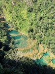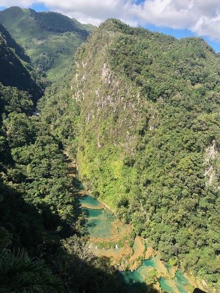 mit dem josch, der josi oder einem pickup-shuttle. der weg soll extrem steil und schmal sein. von der josi wird uns abgeraten – zu steil. für den josch evtl. zu schmal und ggf stressig. gegen den pickup spricht, dass wir evtl die ganze strecke hinten auf der ladefläche zusammengepfärcht fahren müssen. das wollen wir nicht. also stehen wir ganz früh auf und sind die ersten am shuttle und können in der kabine auf der rückbank sitzen. perfekte lösung. die strecke ist weniger schlimm als erwartet. hätten wir auch mit der josi geschafft, aber so ist es für uns entspannter. als wir ankommen wandern wir zunächst ca. 1 h den berg rauf zum mirador. die aussicht auf die becken ist perfekt. semuc champey ist übrigens maya und heisst frei übersetzt „dort wo der fluss im berg verschwindet“. die becken die wir nun von oben sehen, stellen nur einen minimalen teil des flusses dar. der löwenanteil fliesst unter den becken hindurch und kommt nach ca 200 m wieder raus. wir sind ja recht früh dran, und so müssen wir warten bis die sonne hoch genug steht damit die becken voll in der sonne liegen. während des wartens trudeln einheimische obsthändler ein und bauen ihre kleinen mitgebrachten tische auf. wir kaufen etwas von dem leckeren frischen obst. und nach und nach treffen auch andere touristen ein. dann nach ca. 1,5 h haben wir das, was wir sehen wollten. in allen becken spiegelt sich die strahlend scheinende sonne. das warten hat sich gelohnt. dadurch das wir oben etwas länger waren, ist es nun unten an den becken nicht mehr menschenleer. wir springen in das herrlich klare wasser und werden auch schnell von den kleinen fischen gereinigt. das sind die fische, die auch in manchen pedikürshops in den becken die füße von der hornhaut befreien. und die knabbern nicht nur an den füßen sondern auch an meinem rücken.