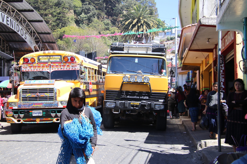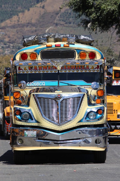 mehr noch als in den bereichen in denen wir bisher waren, wird das stadtbild auch von den sog. „chicken-busses“ – so nennen die gualtemateken selbst ihre bunten busse – geprägt. einer farbenprächtiger als der andere. und alle immer strahlend sauber glänzend. man könnte denken, dass der fahrer mit dem schönsten bus ein preis gewinnt, so raugeputzt sind die busse. mit so einem wollen wir gerne einmal fahren.