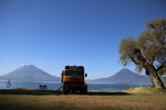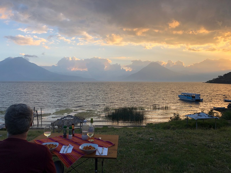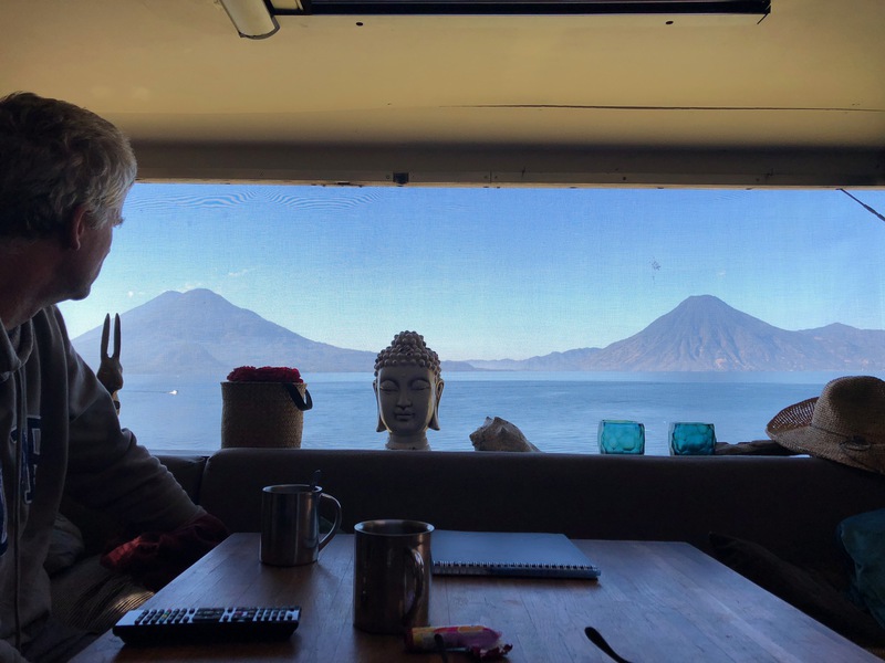 wir fahren noch ein stück weiter den berg runter, um direkt an den see zu gelangen. wenige hundert meter vor panajachel, geht rechts sehr spitz eine schmale straße ab. dort finden wir auf einer wiese direkt am see mit herrlichem blick auf die 3 vulkane einen traumhaften stellplatz. einen kleinen wackligen holzsteg gibt es auch, der das gesamtbild vervollkommnet. wir öffnen die hinteren türen und haben auch aus dem josch heraus einen traumhaften ausblick. so lassen wir den tag ausklingen.