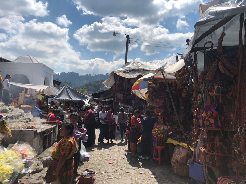 heute ist sonntag. und was ist immer sonntags. markttag. und der in chichicastenango soll besonders schön sein. angeblich einer der größten uns schönsten zentralamerikas. wir fahren wieder mit dem bus. allerdings müssen wir dieses mal 2 mal umsteigen. das erste mal in sololá und das zweite mal in encuentros. die letzte strecke, also von encuentros nach chichi (tschitschi) müssen wir in einem kleinbus fahren. gibt auf der stecke keinen chickenbus. finden wir zwar nicht gut, hilft aber nichts. also zwängen wir uns mit insgesamt 20 leuten in den minibus. wir sitzen zwar, aber weder nebeneinander noch bequem. aber besser als stehen. denn stehplätze gibt es auch. immer wieder steigen welche aus und neue zu. die leute sind noch gar nicht ganz drinnen, da fährt der fahrer auf zeichen seines kassierenden gehilfen auch schon los. der gehilfe hängt dann noch draussen auf dem trittbrett und schliesst dann, wenn alle verstaut sind, die tür während der fahrt. aber läuft alles sehr gesittet und ohne zwischenfälle ab. dann erreichen wir endlich chichicastenango. hier hat man den eindruck das nicht in der stadt markt ist sondern die ganze stadt ist der markt. egal in welche richtung man auch läuft, man ist auf dem markt. daher sind es auch nicht immer nur mobile stände sondern oftmals auch „normale läden“, die ihre auslage in die strasse erweitert haben. ein riesiges, buntes sehr lebendiges treiben. überall wird geguckt, gehandelt, geschachert und gekauft. und wir mittendrin auf der suche nach schönen dingen. so langsam kennen wir uns aus und haben uns auch an die etwas aufdringliche art der verkäufer gewöhnt. man muss sie einfach ignorieren. bei einer frau, die mit ihren waren auf dem arm durch den markt geht, interessieren wir uns für einen tischläufer, nehmen in dann aber wegen der farben nicht. andere farben hat sie nicht. zunächst nicht. denn innerhalb der nächsten 20 min läuft sie uns nach und bringt uns immer wieder läufer in anderen farben. erstaunlich dass sie uns auch immer wieder findet. so viel engagement belohnen wir und nehmen den letzten der uns von den farben dann auch sehr gut gefällt. und auch so finden wir noch ein paar stoffe die wir schön finden und die wir mitnehmen. zwischendurch machen wir eine pause in einem kleinen cafe. der cappuccino hier in guatemala ist übrigens köstlich.