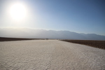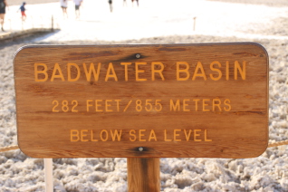 war es im canyon windstill, so weht im valley ein sehr starker wind. obwohl dieser wind sehr warm ist, so verschafft er doch ein wenig kühlung. das macht den besuch von badwater nicht ganz so heiss. badwater liegt 85,5 m unter dem meeresspiegel und ist damit der tiefste punkt und auch der heißeste der usa. es liegt in einer salzpfanne, die aus einem vor ca. 3000 jahren ausgetrockneten see herrührt. hier gibt es zwar wasser, aber das ist ungeniessbar salzig. eben „bad water“. hier haben sicher viele siedler ein böses erwachen gehabt, als sie glaubten endlich wasser gefunden zu haben.
