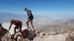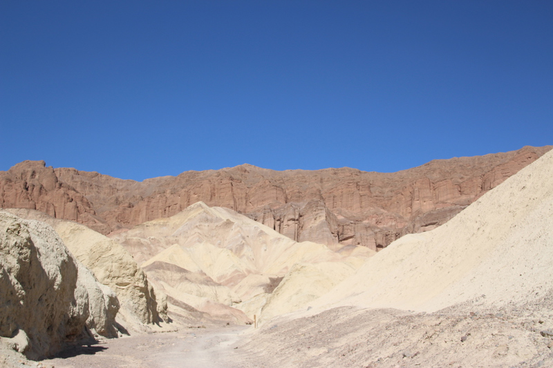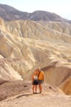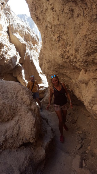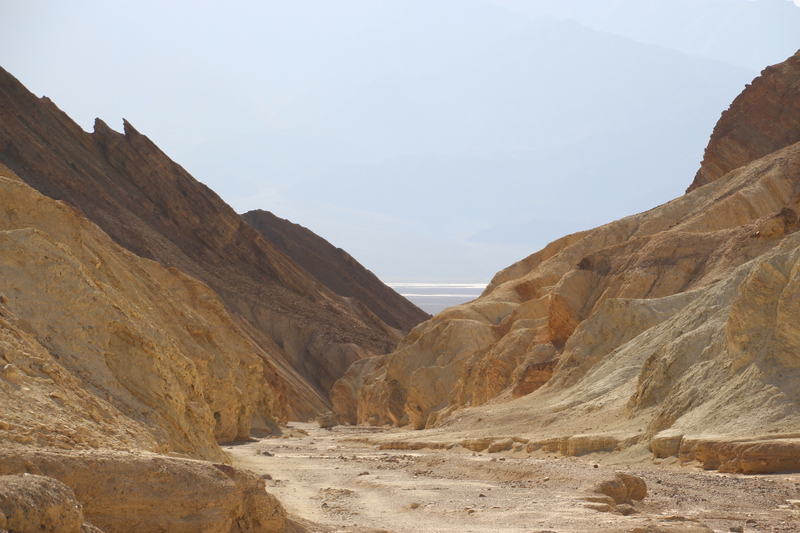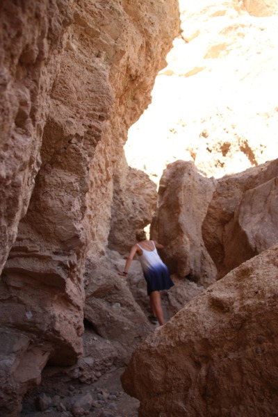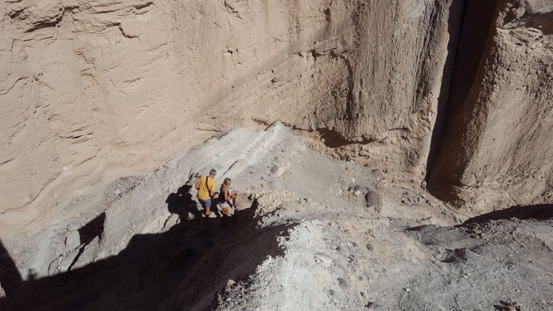 anschliessend durchwandern wir den golden canyon bis zur kathedrale. einer gesteinsformation die an eine kathedrale erinnert. der canyon geht vom eigentlichen tal ab und schlängelt sich durch die berge. es ist affig heiss. man erkennt im trockenen sand noch die spuren vom letzten sturzregen, der sicher schon etwas länger zurück liegt. aber man kann sich vorstellen, dass wenn es hier mal regnet, dann heftig und dann haben die wassermassen offenbar diesen canyon in den stein gespült. am ende des canyons wird es immer schmaler und wir müssen teilsweise durch kurze tunnels klettern bevor wir die kathedrale erreichen. von hier oben hat man eine tolle aussicht.
