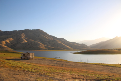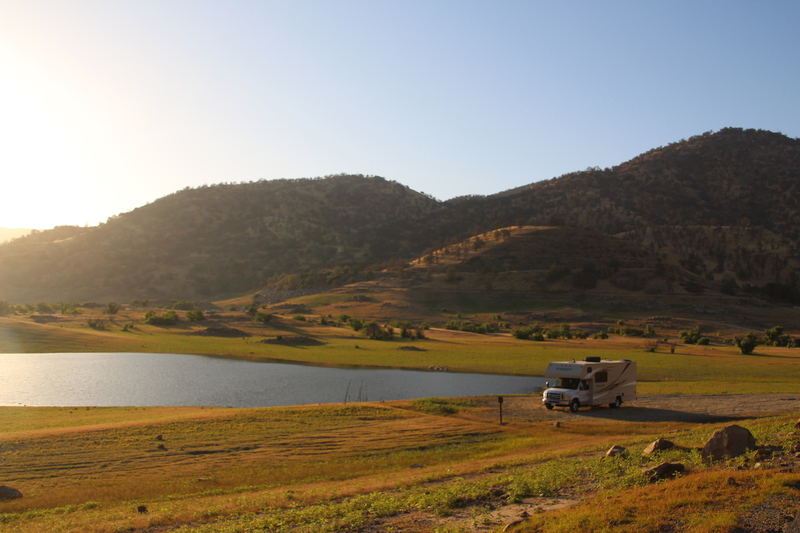 der sequoia national park liegt 515 km entfernt und der weg dorthin führt über sehr enge und kurvenreiche straßen. mit dem motorrad ein traum, mit dem langen camper auf dauer etwas anstrengend. kurz bevor wir unser tagesziel, three river erreichen entdecken wir einen wunderschönen nachtplatz direkt am kaweah see. beim essen und anschließenden kartenspiel haben wir einen herrlichen ausblick auf den see und die dahinterliegenden berge. das sind die plätze die wir lieben. als dani am nächsten morgen ein paar fotos macht entdeckt sie sogar einen kojoten.