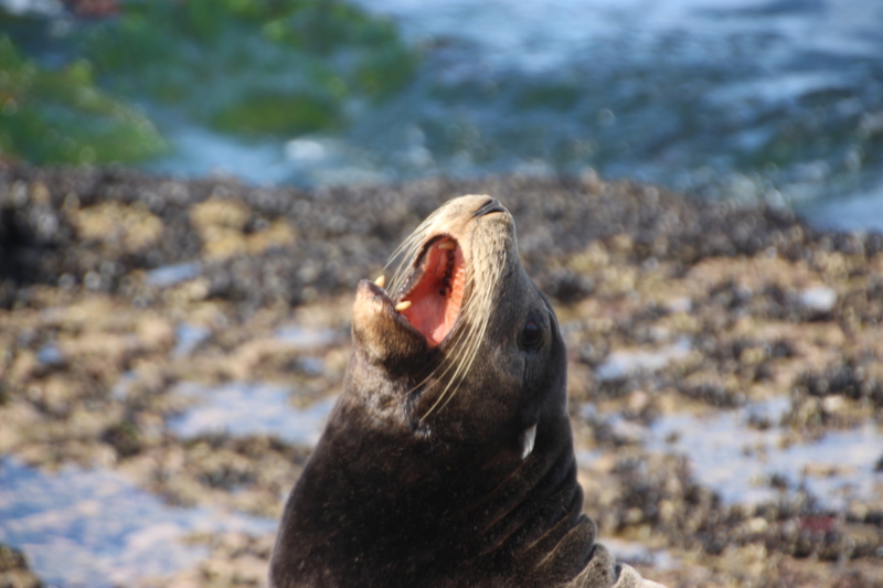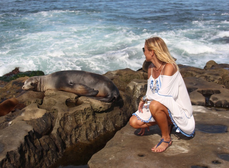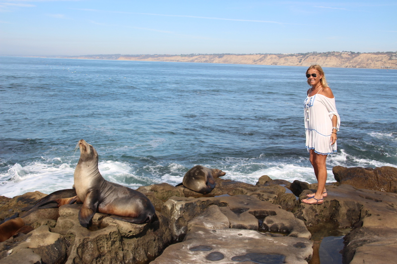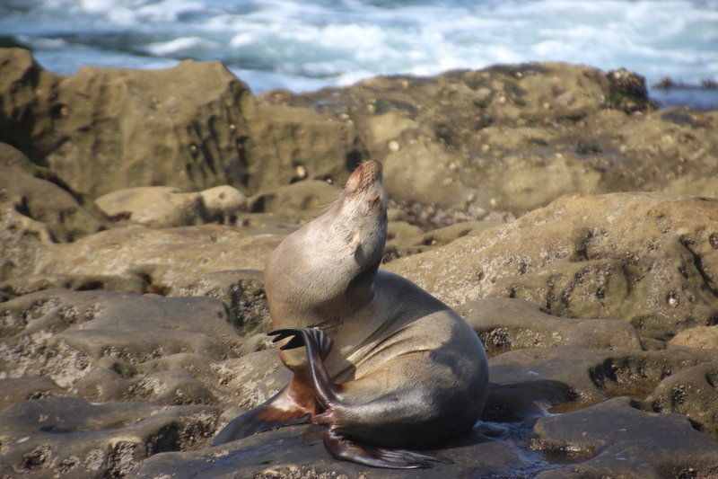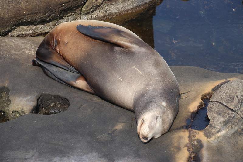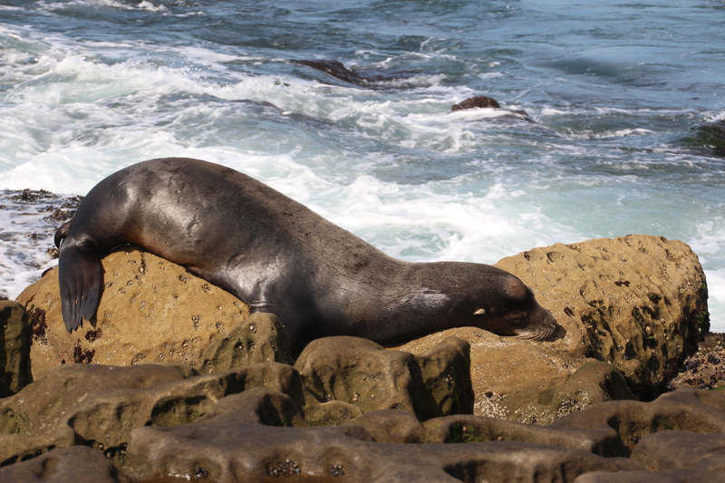 eine empfehlung aus dem internet die ihre berechtigung hat. die bucht "la jolla cove" mit ihrer größtenteils felsigen küste wird nicht nur von menschen besucht, sondern auch von seelöwen und seehunden, die sich auf den felsen in der sonne ahlen. sie lassen sich auch kaum von den vielen besuchern stören. ganz im gegenteil, man hat den eindruck sie genießen die aufmerksamkeit und posieren gerne für ein foto. nur als dani versucht eine der robben zu streicheln kriegt sie eine klare ansage und wir beide einen ziemlichen schreck.