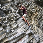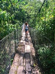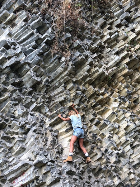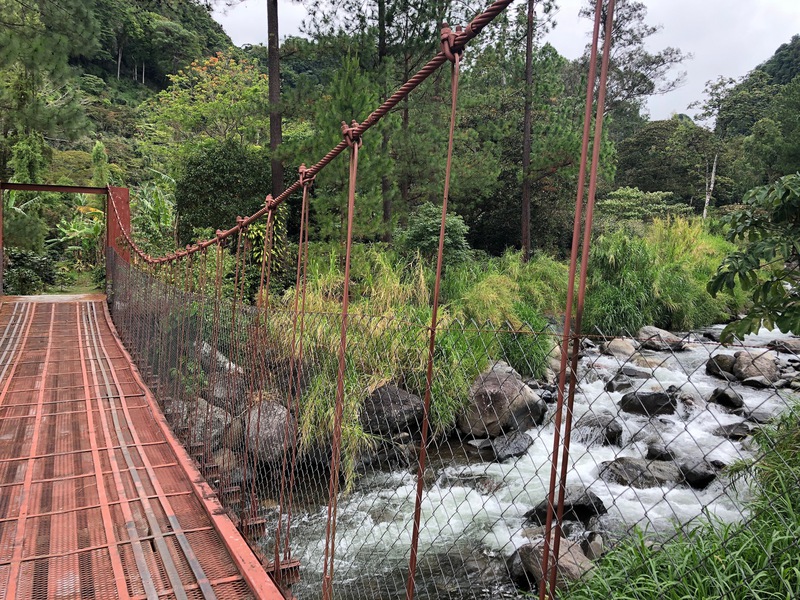 die mit 28 °c für uns derzeit relativ milden temperaturen und die umliegenden berge laden zu wanderungen ein. am 1. tag durchwandern wie die bajo monos. eine schlucht die durch den oberlauf des rio caldera entstanden ist. früher lebten hier unzählige kapuzineraffen. daher auch der name „schlucht der affen-bajo monos“. der weg führt uns zunächst zu einer ungewöhnlichen senkrechten felswand. sie besteht aus tausenden fast quadratischen basaltstäben, die alle leicht gebogen nebeneinander gelegt die felswand ergeben. teilweise stehen die enden aus der wand heraus, teilweise sieht man auf die längsliegenden meterlangen stäbe. manche enden sind bereits locker, so daß man ein stabende abbrechen könnte. angeblich verwenden die einheimischen die steine auch zum mauern ihrer häuser. andere verwenden die wand als kletterwand. wir als fotomotiv. nachdem wir eine etwas in die jahre gekommene hängebrücke überquert haben, führt der weg immer am fluss entlang, vorbei an diversen total schönen kleinen kaffeeplantagen. eine plantage gefällt uns ganz besonders. sie liegt auf der anderen seite vom fluß und ist nur über eine hängebrücke zu erreichen. wir könnten uns vorstellen irgendwann einmal dieses grundstück zu erwerben und hier kaffee zu züchten, ein paar glampingzelte zu bauen und so unseren lebensabend zu verbringen. allerdings würden wir die hängebrücke in eine zugbrücke umbauen. dann hätten wir den fluss als burggraben.
