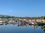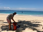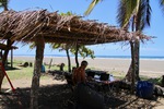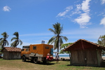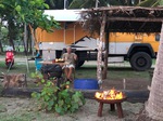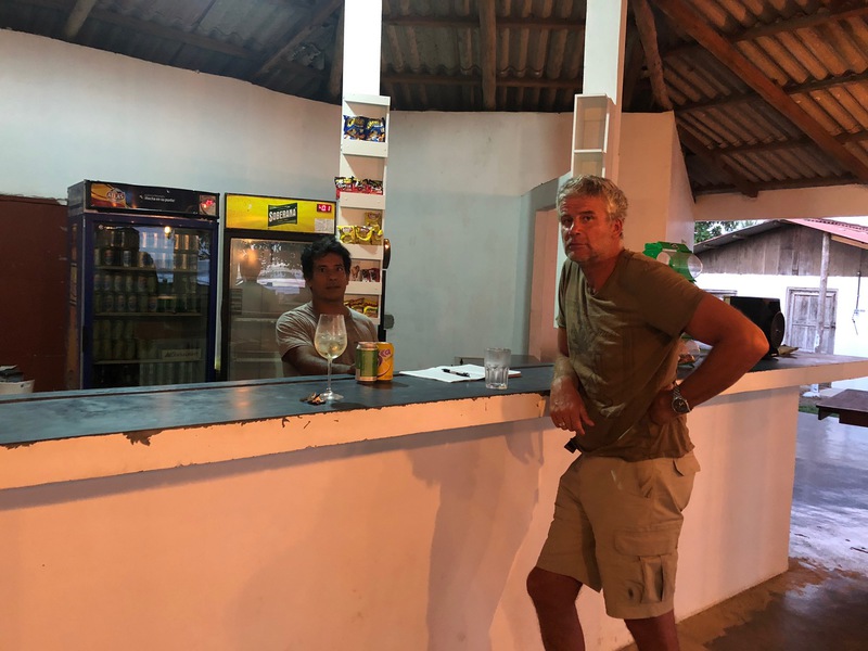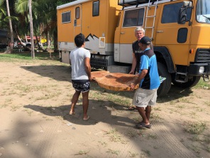 am letzten abend fragen wir roy, den eigentümer, ob er uns nicht seine tischplatte (eine 1,5 m baumscheibe von einem mangobaum) verkaufen will. roy war viele jahre in europa unterwegs und spricht sehr gut deutsch. aber er scheint noch nicht überzeugt und tut sich sehr schwer einen preis zu nennen. wir schlagen vor, er soll sich gedanken machen und sich später bei uns melden. am nächsten morgen, als wir uns verabschieden wollen, hakt dani noch einmal nach und wir werden uns schnell handelseinig.