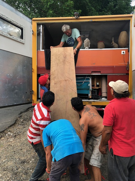 mehr oder weniger spontan entscheiden wir an einem der nachmittage, zurück zu einem holzhändler zu fahren, bei dem wir auf dem weg nach panama gehalten und tolle hölzer gesehen haben. wir kaufen zwei riesige bohlen aus cedar. extrem schwer und sperrig, aber auch extrem schön. für den dachträger sind sie zu lang. das problem ist, dass sie nur in den inneraum passen und der transport bei der verschiffung laut reederei so nicht erlaubt ist. egal, wir machen es trotzdem und hiefen sie mit 4 mann in den innenraum und hoffen, dass wir sie so letztendlich bis nach hause transportiert bekommen und uns die reederei keinen strich durch die rechnung macht.