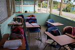 kurz bevor wir chiriqui grande, den letzten ort bevor die strasse ins landesinnere bzw. an die pazifikseite verschwenkt, erreichen, biegen wir richtung meer auf eine kleine straße ab. die strasse endet kurz darauf am meer in einem kleinen ort, der vielleicht aus 10-15 häusern und einer schule besteht. wir dürfen einen kurzen blick in die klassenräume werfen. dani macht auch ein paar bilder mit den schulkindern, die gerade pause haben. besonders angetan hat den kindern die oreos, die dani in ihrer tasche hat. die zaubern sehr viele glückliche gesichter. dann ruft die lehrerin und alle kinder strömen widerwillig zurück in die klassenräume. das scheint überall gleich zu sein.
