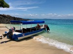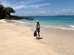 am nächsten morgen präsentiert sich der himmel strahlend blau. perfektes wetter für eine schnorcheltour zu den vorgelagerten inseln. empfohlen wurden uns bolanos und gamez. nach kurzer verhandlung mit einem bootseigentümer einigen wir uns auf 100 $, für die fahrt zu den beiden inseln. als erstes steuern wir einen kleinen strahlend weißen strand auf bolanos an. das wasser leuchtet in türkisblau und als wir uns dem strand nähern sieht man bereits durch das kristallklare wasser, das ca. 2 m tiefgelegene riff. wir werden am strand abgesetzt. und während wir schnorcheln, ankert unser boot in einiger entfernung. kurz nachdem wir angekommen sind, verlassen die gäste eines anderen bootes den strand, so daß wir nun die einzigen auf der insel sind. robinson und freitag. nach dem schnorcheln und einem kurzem sonnenbad fahren wir weiter nach gamez. unser kapitän meint, dort sei der strand und das wasser schöner, aber es gäbe kein riff zum schnorcheln. seine auffassung teilen wir nicht so ganz. wir fanden bolanos schöner. aber gamez ist auch total schön und so erleben wir hier auch noch herrliche stunden.